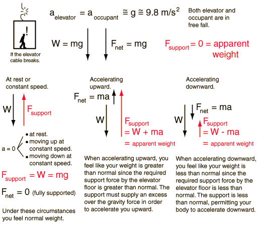 The phenomenon of "weightlessness" occurs when there is no force of support on your body. When your body is effectively in "free fall", accelerating downward at the acceleration of gravity, then you are not being supported. The sensation of apparent weight comes from the support that you feel from the floor, from a chair, etc. Different sensations of apparent weight can occur on an elevator since it is capable of zero or constant speed (zero acceleration) and can accelerate either upward or downward. If the elevator cable breaks then both you and the elevator are in free fall. The resultant experience of weightlessness might be exhilirating if it weren't for the anticipation of the quick stop at the bottom.