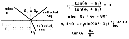 Polarization by ReflectionSince the reflection coefficient for light which has electric field parallel to the plane of incidence goes to zero at some angle between 0° and 90°, the reflected light at that angle is linearly polarized with its electric field vectors perpendicular to the plane of incidence. The angle at which this occurs is called the polarizing angle or the Brewster angle. At other angles the reflected light is partially polarized. From Fresnel's equations it can be determined that the parallel reflection coefficient is zero when the incident and transmitted angles sum to 90°. The use of Snell's law gives an expression for the Brewster angle. ![]()